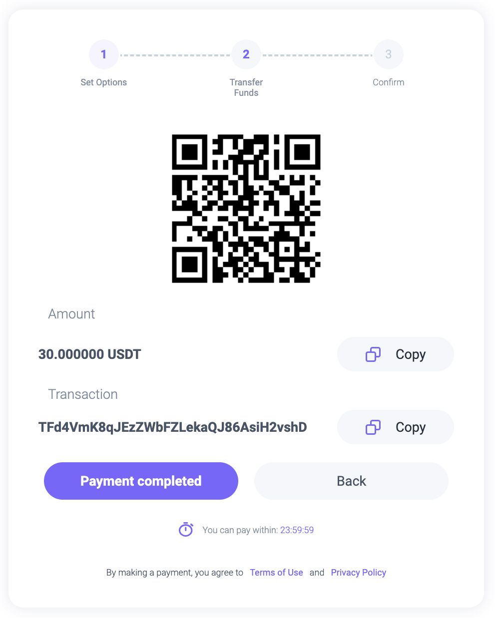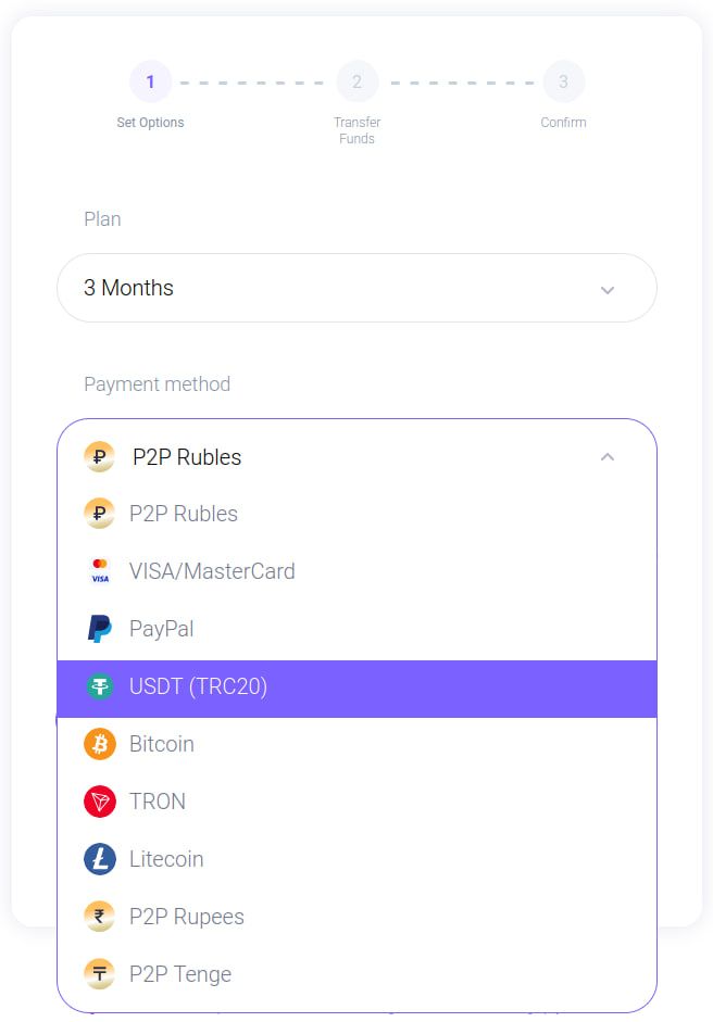 After selecting the tariff, you will be redirected to the special payment form. Choose the payment method USDT (TRC20) and then click on the button Purchase
