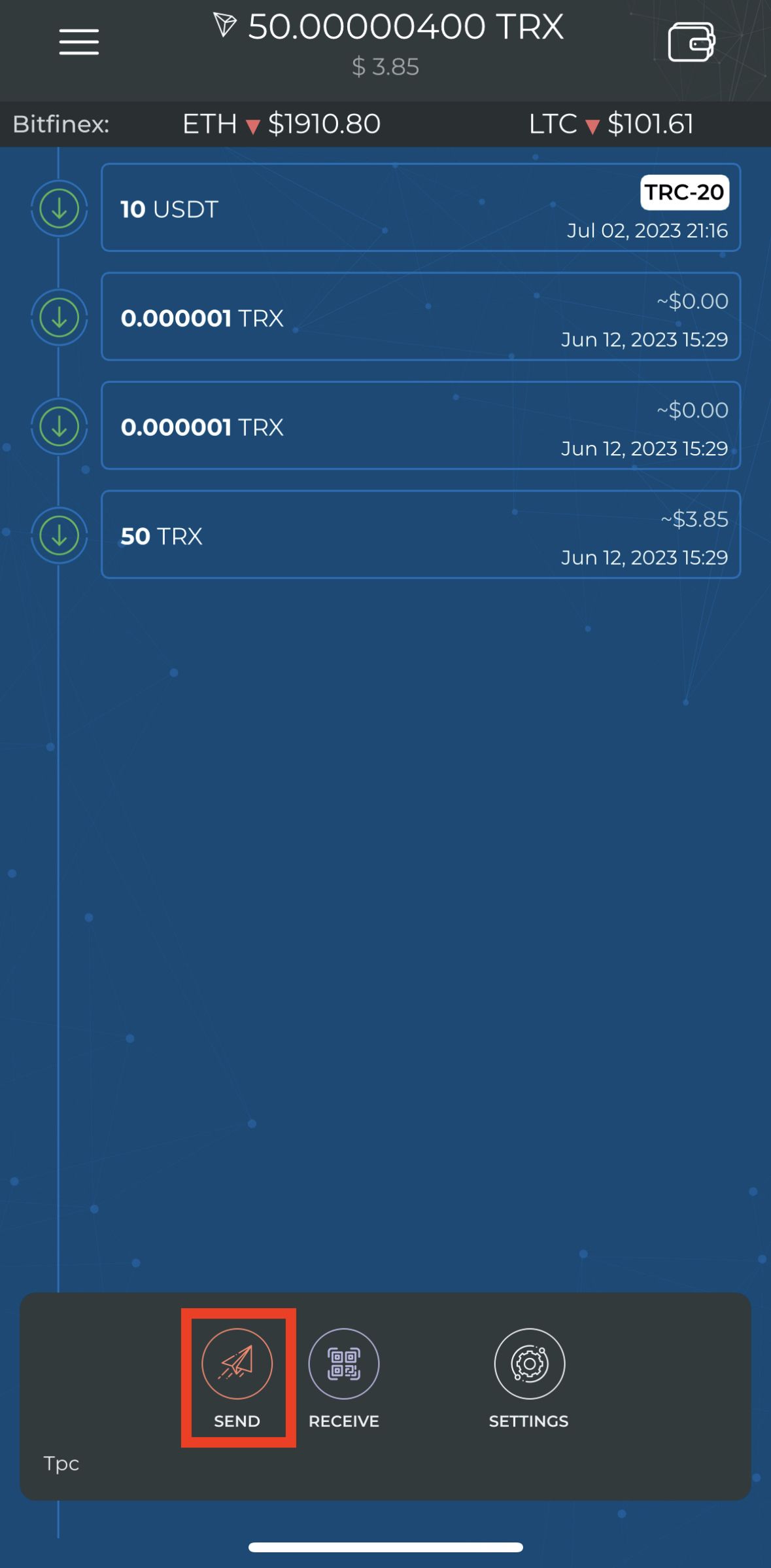 On the right side, select the QR code scanner and scan the QR code on the website or paste the copied payment address and click the button Send